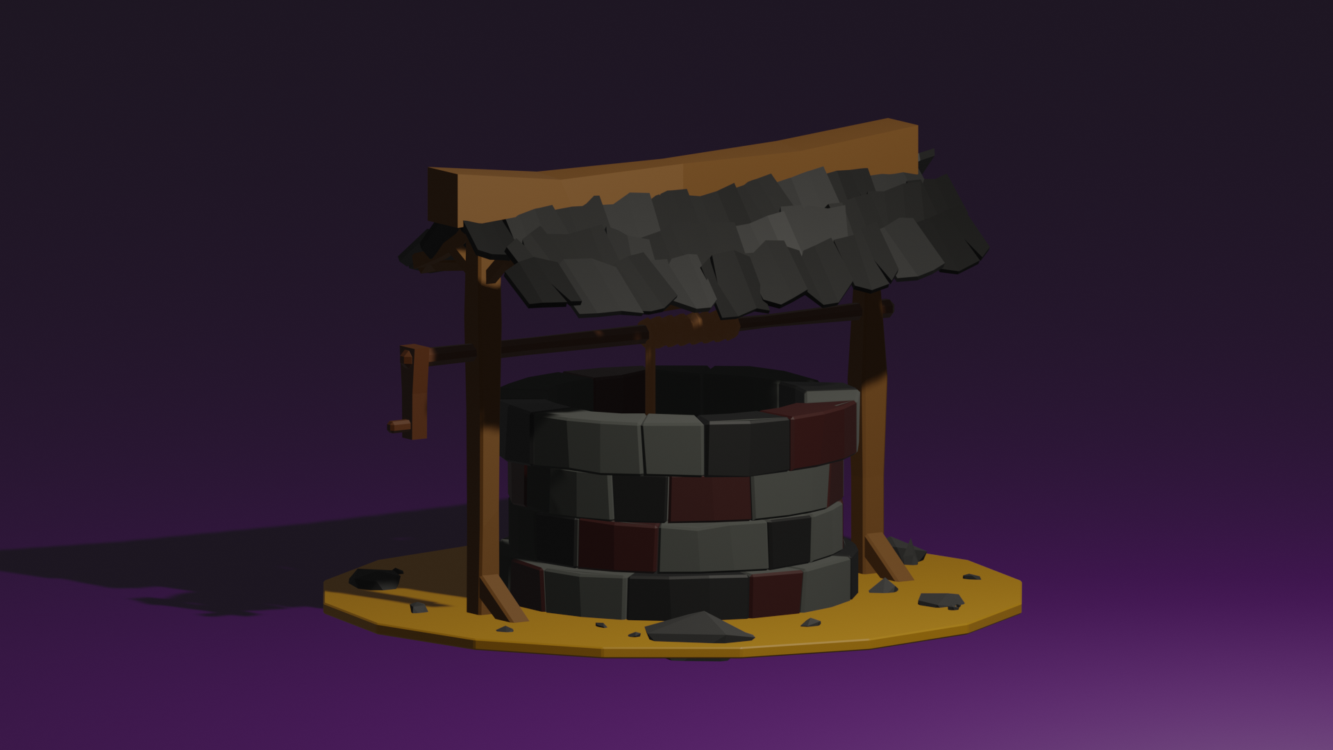 A gauche, vous pouvez voir un puit, toute première de mes réalisations. Rien que cette simple scène m'a appris à manier les outils les plus primaires de Blender.